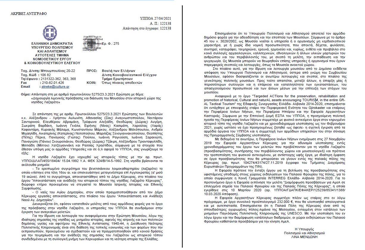 Διαβάστε τι απάντησε η Υπουργός Πολιτισμού στον Κερκυραίο βουλευτή για το Λαζαρέτο.