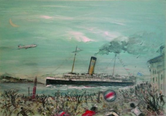 Μια χαρούμενη συντροφική φωνή κι ένα χαμόγελο τον λυτρώνουν με το που πατά τα πόδια του στην «κάργα φορτωμένη», εικονιζόμενη εδώ σε έργο του Σπύρου Κουρσάρη, πενηντάχρονη «Αγγέλικα».