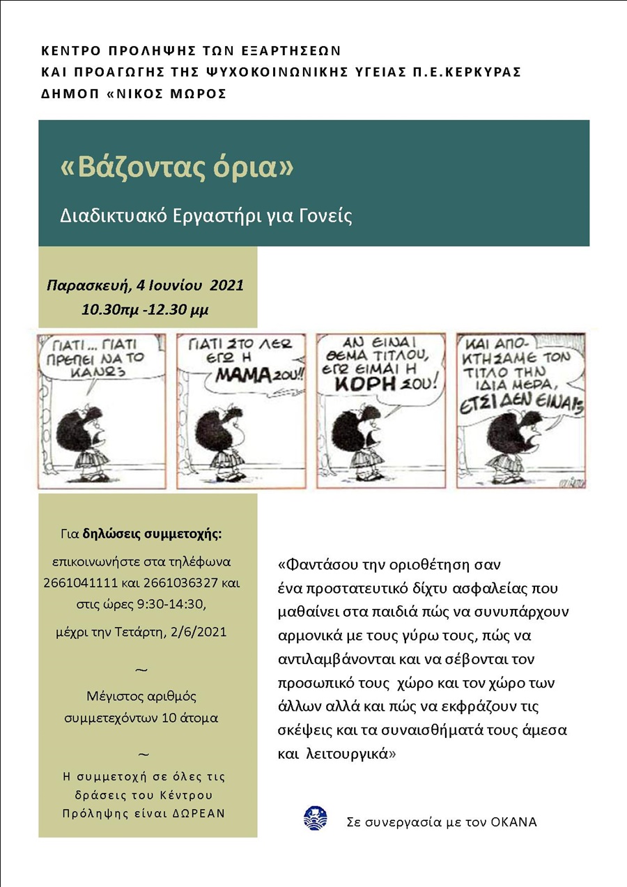 Αν είστε γονείς παιδιών και εφήβων σας προσκαλούμε να λάβετε μέρος στο διαδικτυακό εργαστήρι με τίτλο «Βάζοντας όρια» που διοργανώνει το Κέντρο Πρόληψης των Εξαρτήσεων και Προαγωγής της Ψυχοκοινωνικής Υγείας Π.Ε. Κέρκυρας, ΔΗ.ΜΟ.Π. «Ν. Μώρος» την Παρασκευή, 4 Ιουνίου το πρωί 10.30-12.30