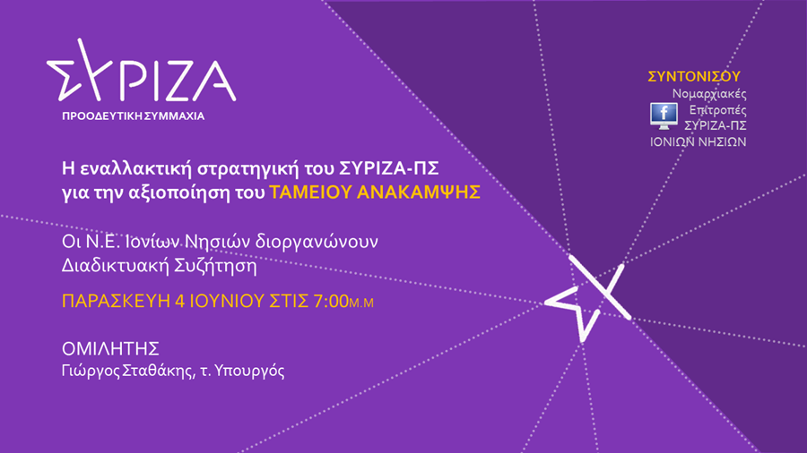 Οι Νομαρχιακές Επιτροπές του ΣΥΡΙΖΑ-ΠΡΟΟΔΕΥΤΙΚΗ ΣΥΜΜΑΧΙΑ Ιονίων Νήσων διοργανώνουν ζωντανή διαδικτυακή εκδήλωση, την Παρασκευή 4 Ιουνίου στις 19:30, με θέμα: