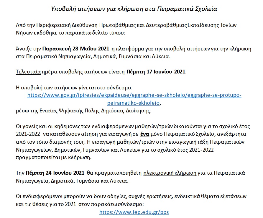 Ανακοίνωση της Περιφερειακής Δ/νσης Εκπαίδευσης σχετικά με την υποβολή αιτήσεων για κλήρωση στα πειραματικά σχολεία