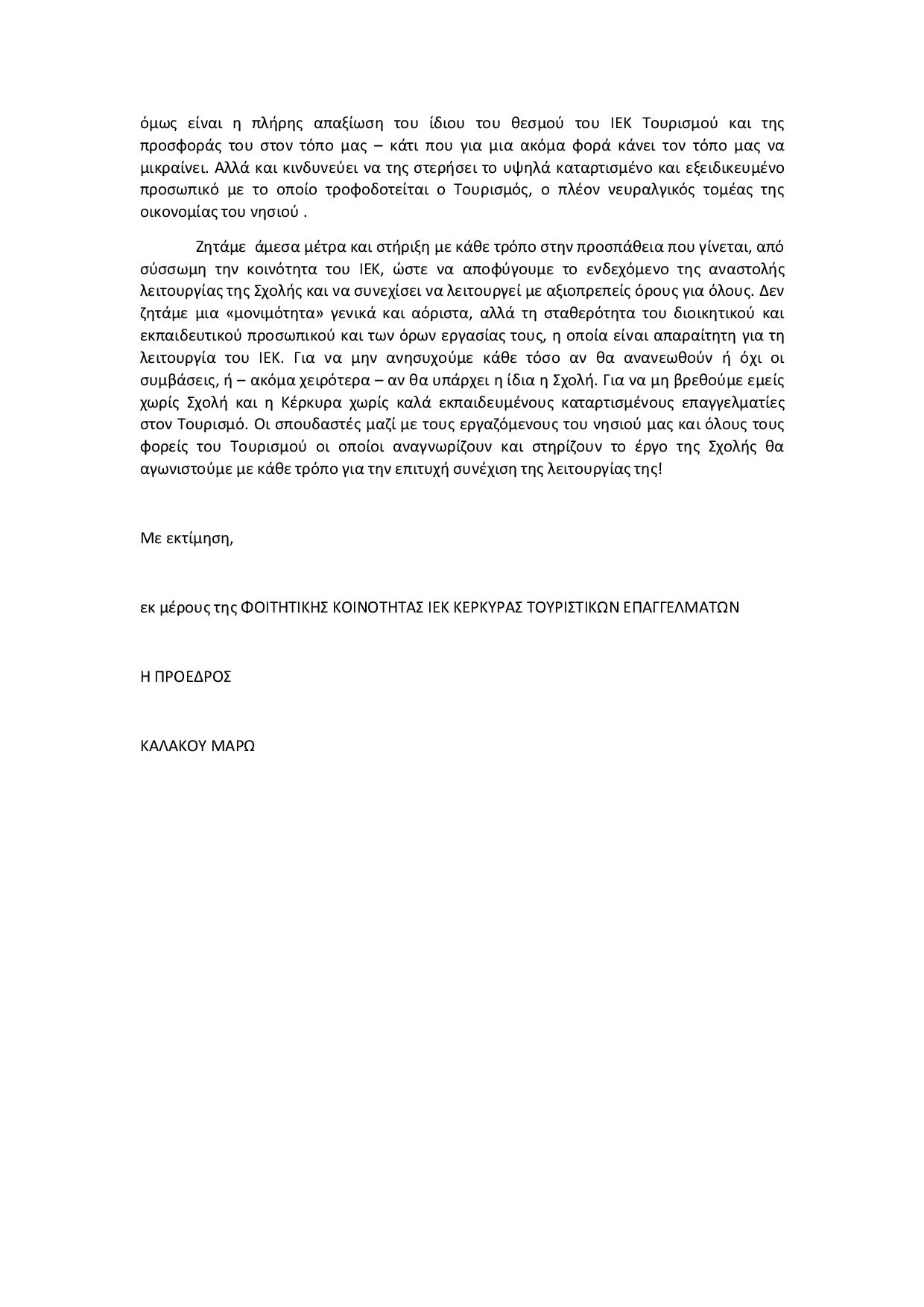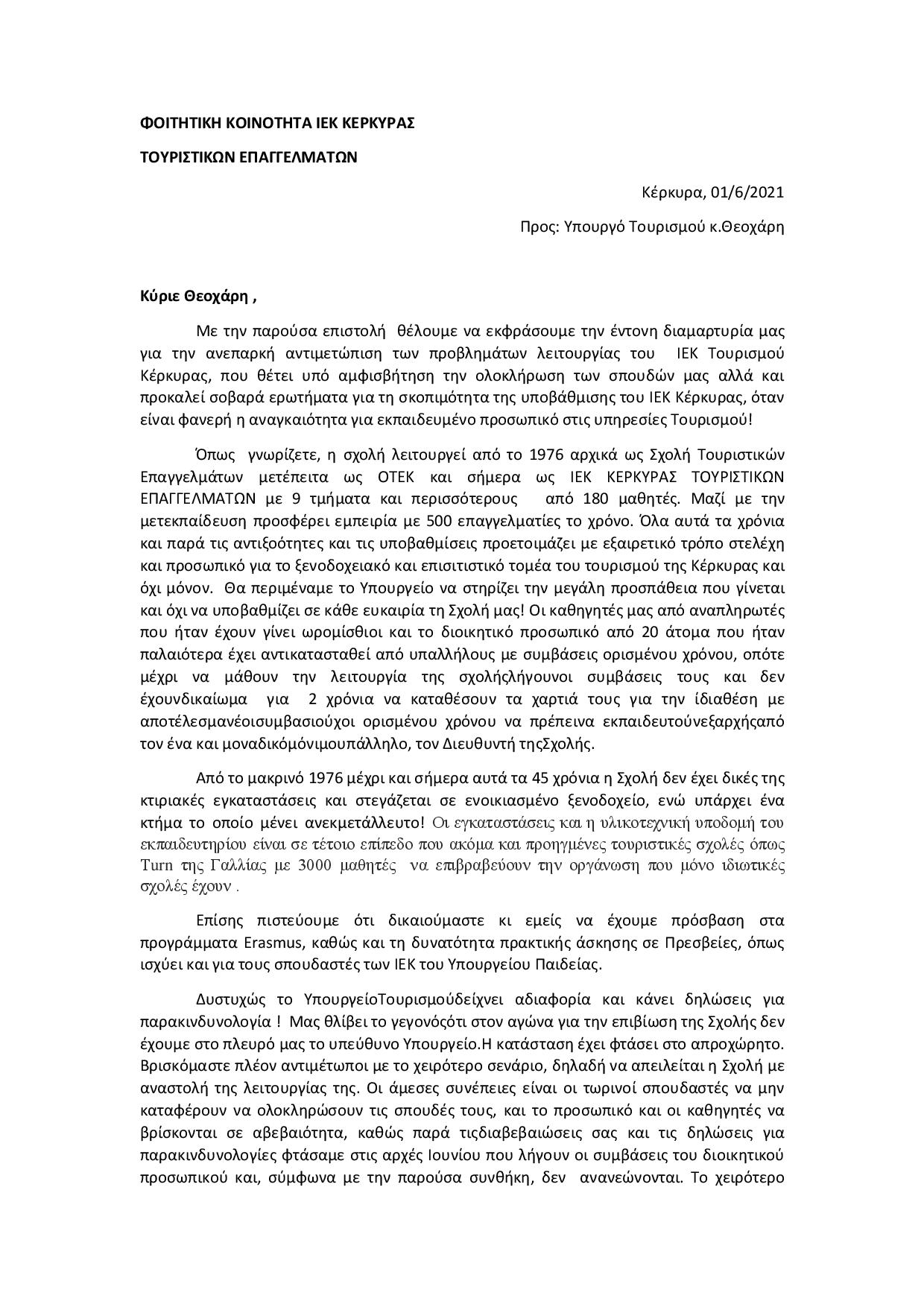 Επιστολή διαμαρτυρίας προς τον Υπουργό Τουρισμού από την φοιτητική κοινότητα του ΙΕΚ Τουριστικών Επαγγελμάτων της Κέρκυρας.
