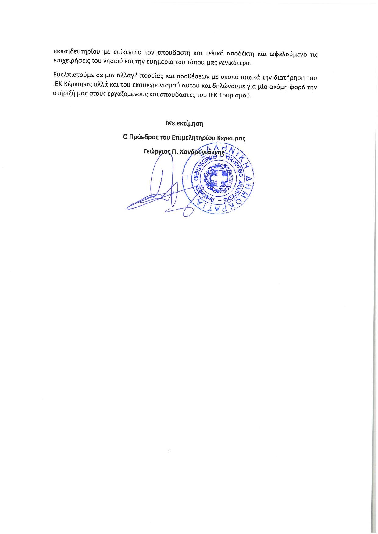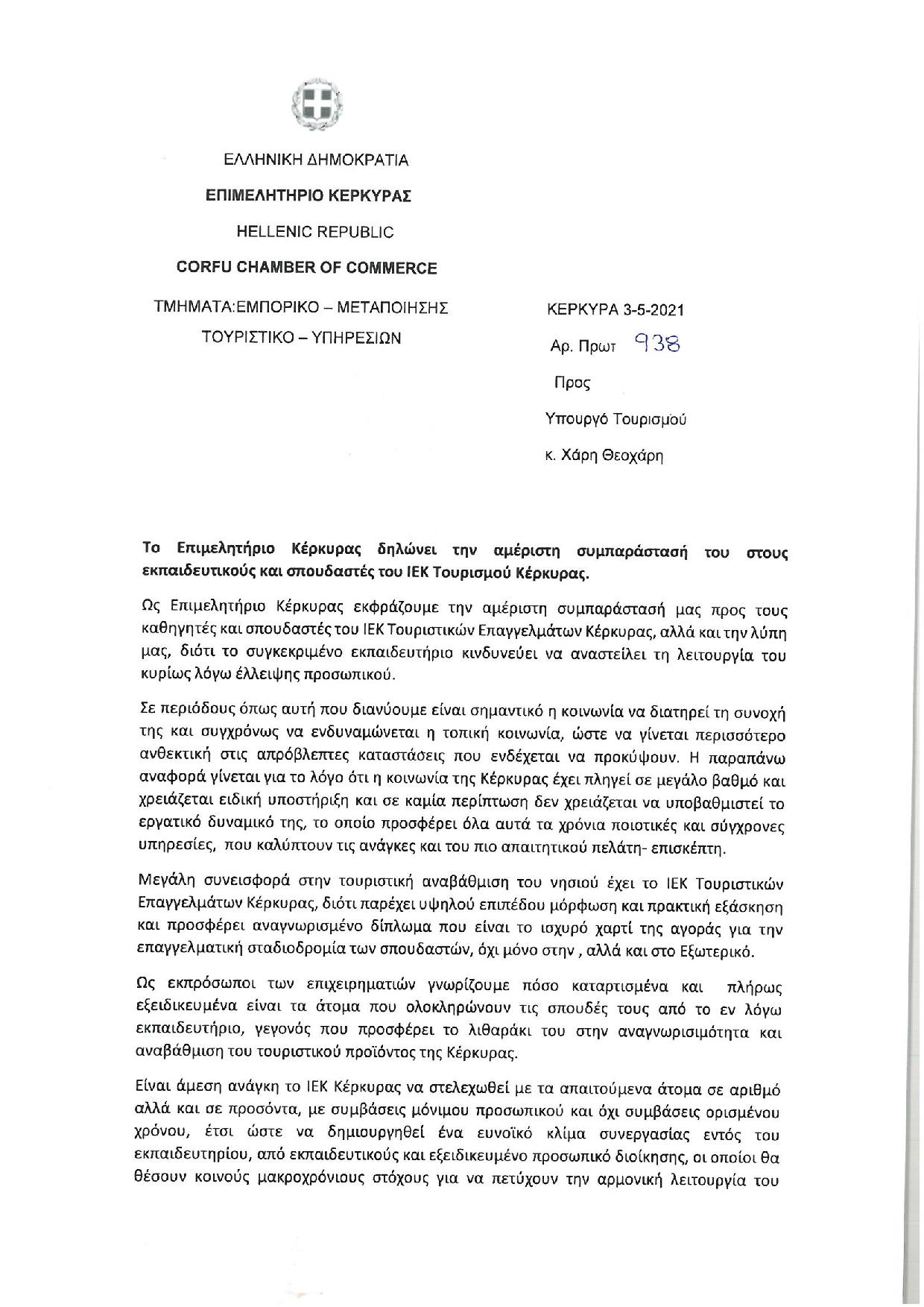 Το Επιμελητήριο Κέρκυρας με επιστολή του προς τον Υπουργό Τουρισμού Χάρη Θεοχάρη εκφράζει την αμέριστη συμπαράστασή προς τους καθηγητές και σπουδαστές του ΙΕΚ Τουριστικών Επαγγελμάτων Κέρκυρας.