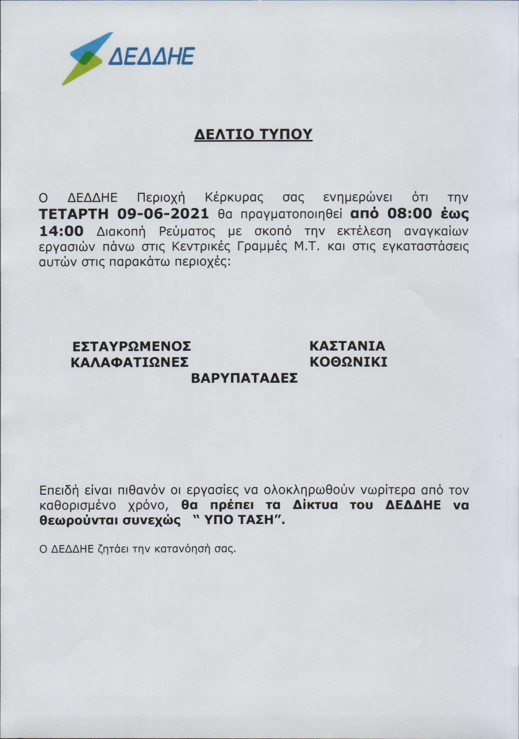 Ο ΔΕΔΔΗΕ ανακοίνωσε πως την Τετάρτη θα πραγματοποιηθούν εργασίες στο Δίκτυο και γι’ αυτό θα υπάρξουν διακοπές ρεύματος.