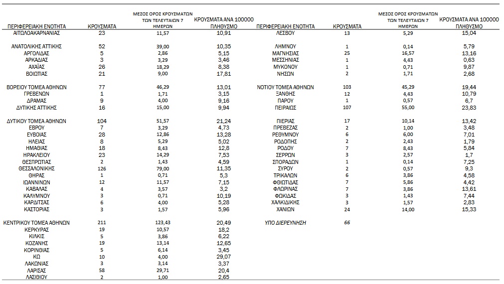 Αναλυτικά, η διασπορά των νέων κρουσμάτων ανά περιφερειακή ενότητα: