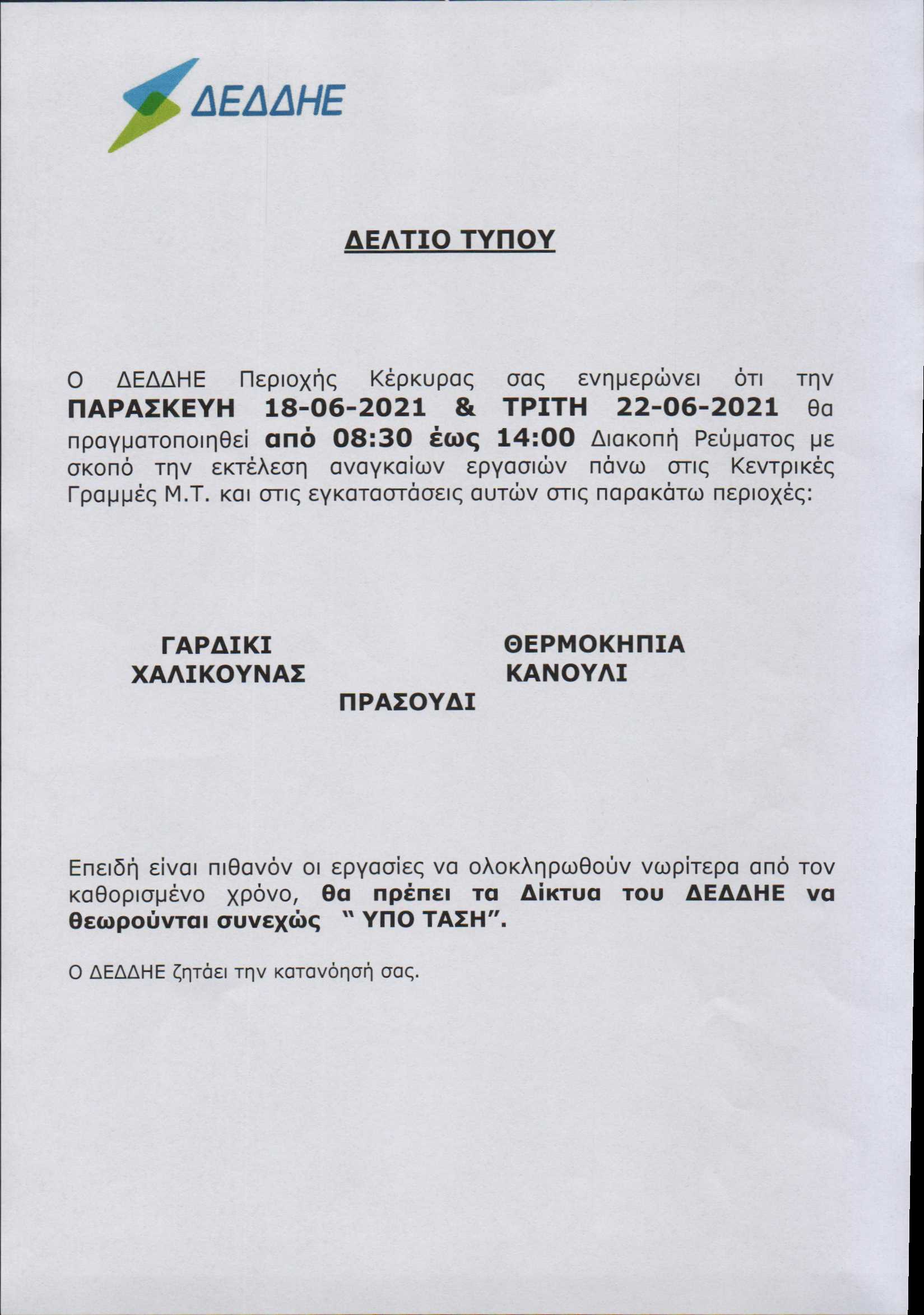 ΚΟΙΝΩΝΙΑΕΛΕΥΘΕΡΟΕΙΔΗΣΕΙΣ Διακοπές ρεύματος στο Νότο την Παρασκευή και την Τρίτη Αιτία, οι εργασίες που θα πραγματοποιήσει ο ΔΕΔΔΗΕ. Last updated: 16/06/2021 09:55 CorfuPress.com Published: 16/06/2021 Share SHARE Αιτία, οι εργασίες που θα πραγματοποιήσει ο ΔΕΔΔΗΕ. Διακοπή ρεύματος τη Δευτέρα-Δείτε που Που θα γίνει διακοπή ρεύματος την Τετάρτη Που θα γίνει διακοπή ρεύματος την Τετάρτη Επιστολή Επιμελητηρίου προς ΔΕΔΔΗΕ για τις πολύωρες διακοπές ρεύματος Που θα γίνουν προγραμματισμένες διακοπές ρεύματος το διάστημα 23-25 Αυγούστου Share This Article Facebook Whatsapp Whatsapp Email Copy Link Print Previous Article Επετειακή συναυλία για τα 200 χρόνια από την Ελληνική Επανάσταση στα Ανάκτορα Next Article Η κυβέρνηση ευνοεί την ασυδοσία & την εκμετάλλευση του εργαζομένου, λέει το ΚΙΝΑΛ Κέρκυρας Δεν υπάρχουν Σχόλια Δεν υπάρχουν Σχόλια Αφήστε μια απάντηση Ακύρωση απάντησηςΗ ηλ. διεύθυνση σας δεν δημοσιεύεται. Τα υποχρεωτικά πεδία σημειώνονται με *Σχόλιο * Όνομα * Email * Ιστότοπος Αποθήκευσε το όνομά μου, email, και τον ιστότοπο μου σε αυτόν τον πλοηγό για την επόμενη φορά που θα σχολιάσω. ΑναζήτησηΑναζήτησηRecent PostsΌλα τα μάτια στον Θοδωρή, τον καπετάνιο μας! Τη Δευτέρα 22 Σεπτεμβρίου γιορτάζει… Σαν Σήμερα 22/9: Τα σημαντικότερα γεγονότα… Η πρόγνωση του καιρού Έφηβοι Ιονίου: Με περίπατο, συνεχίζουν στο Rising Stars! Recent CommentsΧωρίς σχόλια για εμφάνιση.