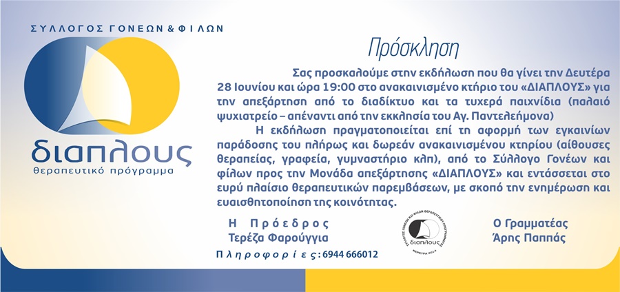 Ο Σύλλογος Γονέων και φίλων «ΔΙΑΠΛΟΥΣ» διοργανώνει εκδήλωση την Δευτέρα 28 Ιουνίου και ώρα 19:00 στο ανακαινισμένο κτήριο του «ΔΙΑΠΛΟΥΣ» για την απεξάρτηση από το διαδίκτυο και τα τυχερά παιχνίδια (παλαιό ψυχιατρείο – απέναντι από την εκκλησία του Αγ. Παντελεήμονα)