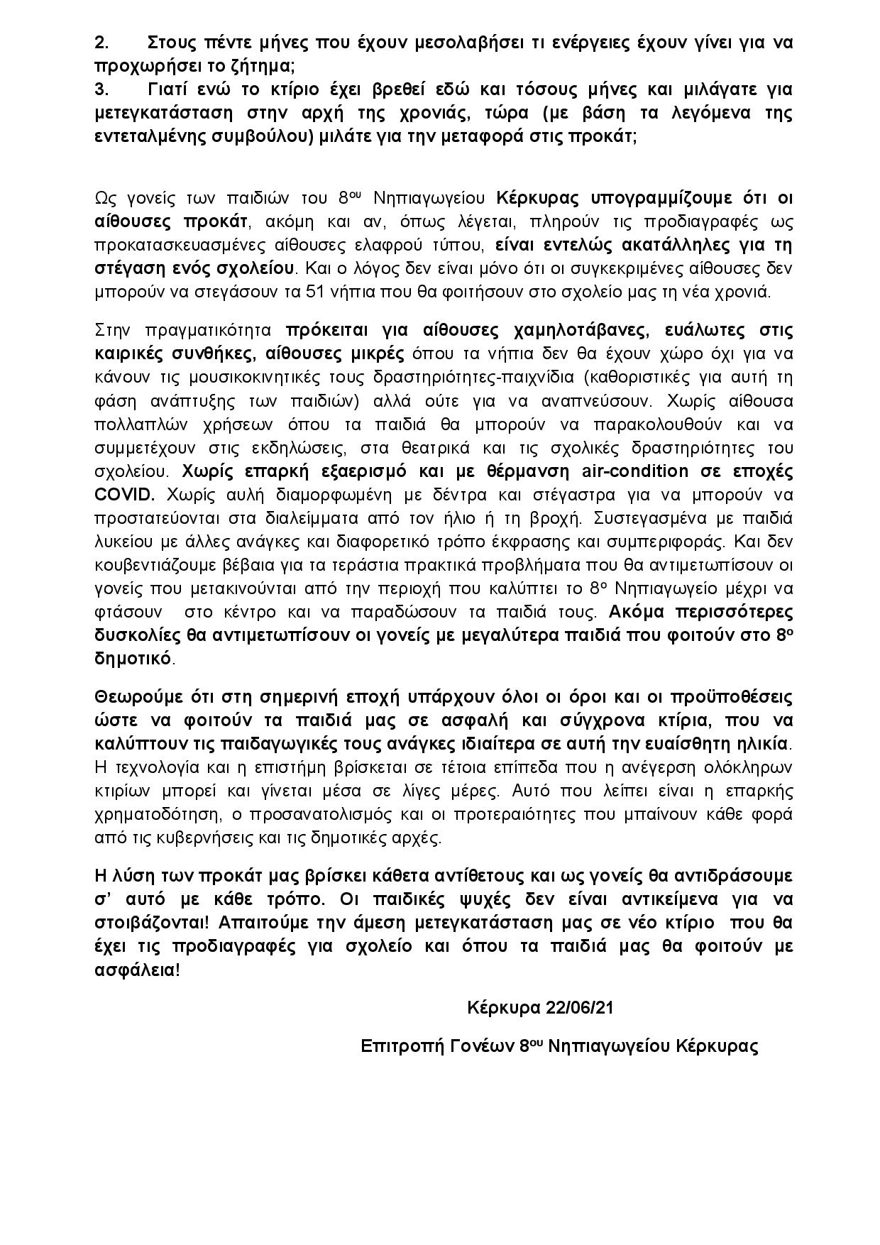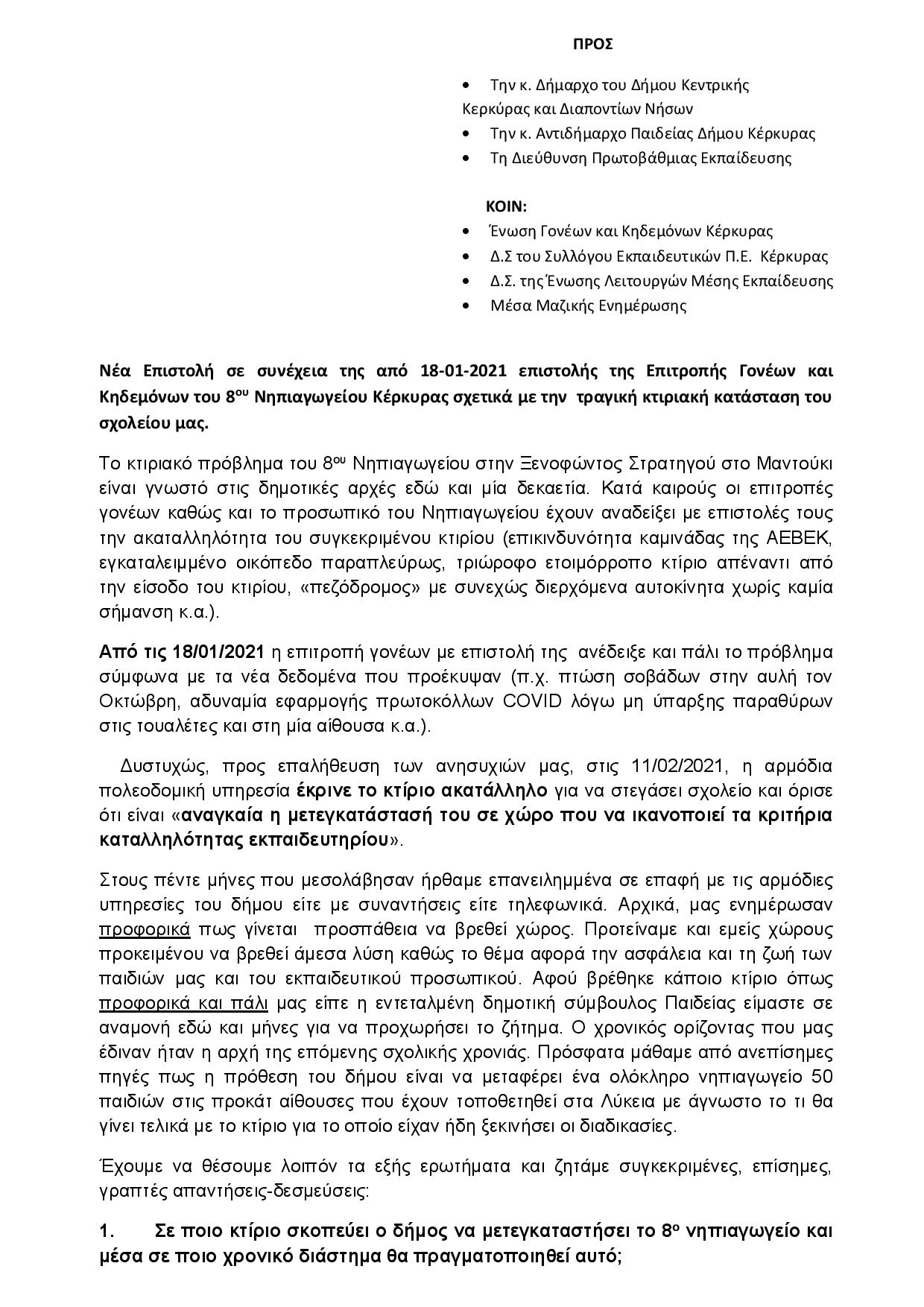 Nέα επιστολή των γονέων του 8ου νηπιαγωγείου που αναφέρεται στο κτιριακό πρόβλημα που υπάρχει.