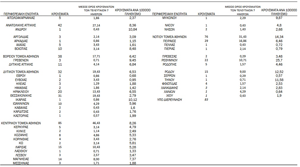 Αναλυτικά, η διασπορά των νέων κρουσμάτων ανά περιφερειακή ενότητα:
