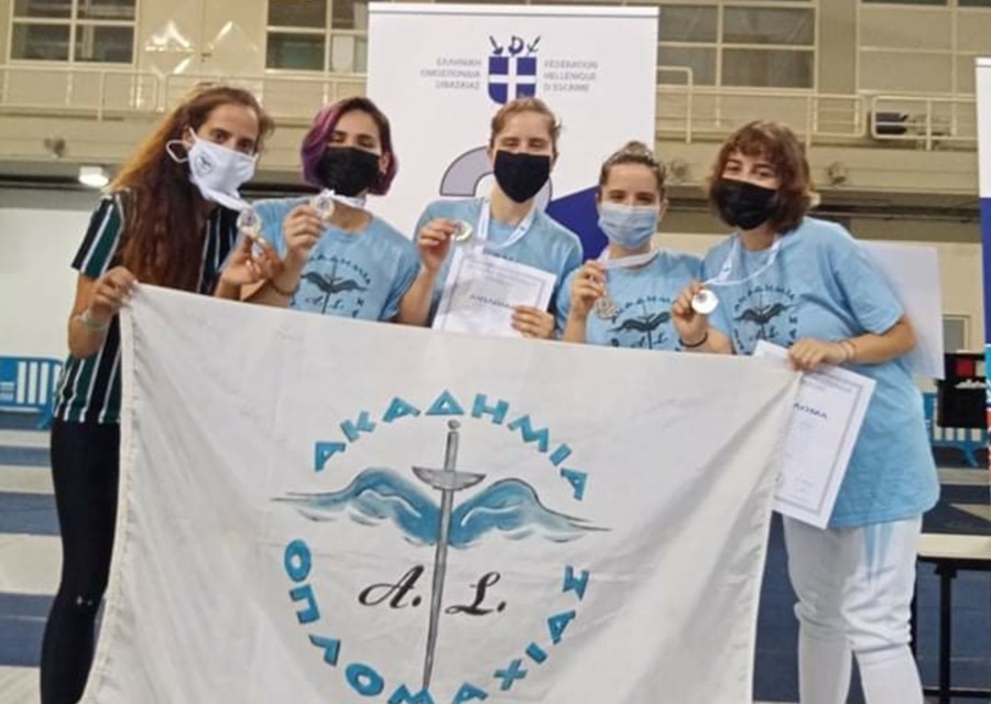 Η Κερκυραία αθλήτρια Χαριτίνη Αντωνία Κούρκουλου Κουσουνή (2η από αριστερά) κατέκτησε το αργυρό μετάλλιο με την ομάδα του Α.Σ.Α.Ο. στους Πανελλήνιους αγώνες ομαδικού ξίφους Ασκήσεως Νέων Γυναικών που πραγματοποιήθηκε την Κυριακή 4/7/21 στο ΟΑΚΑ.