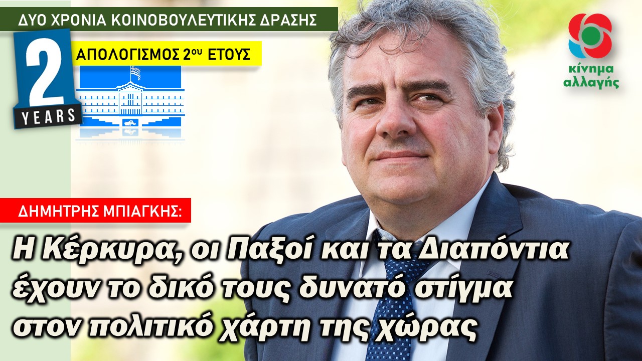Την Τετάρτη 7 Ιουλίου και ώρα 09:00 μ.μ. θα προβληθεί διαδικτυακά το πρώτο μέρος του Απολογισμού της Κοινοβουλευτικής δράσης του 2ου έτους του Βουλευτή Κέρκυρας του Κινήματος Αλλαγής, Δημήτρη Μπιάγκη.