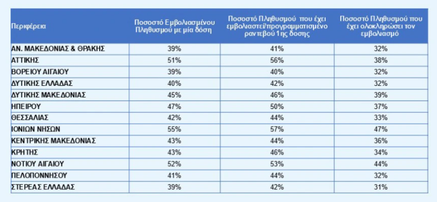 Σχεδόν οι μισοί κάτοικοι της Περιφέρειας Ιονίων Νήσων (47%) έχουν, ήδη ολοκληρώσει τον εμβολιασμό τους (1η θέση), ενώ στην κορυφή των Περιφερειών βρίσκονται τα Ιόνια Νησιά και όσον αφορά στην πρώτη δόση εμβολιασμού (55%).