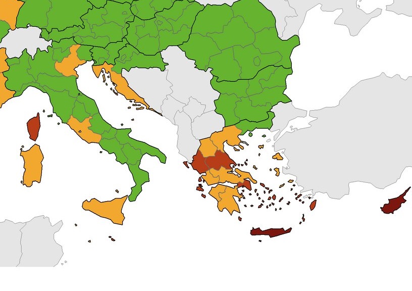 Στο πράσινο βρίσκονται η Ανατολική Μακεδονία και η Θράκη – Στο «πορτοκαλί» τα νησιά του Νοτίου Αιγαίου και του Ιονίου, η Ήπειρος και η Θεσσαλία – Στο πράσινο η Ανατολική Μακεδονία και η Θράκη