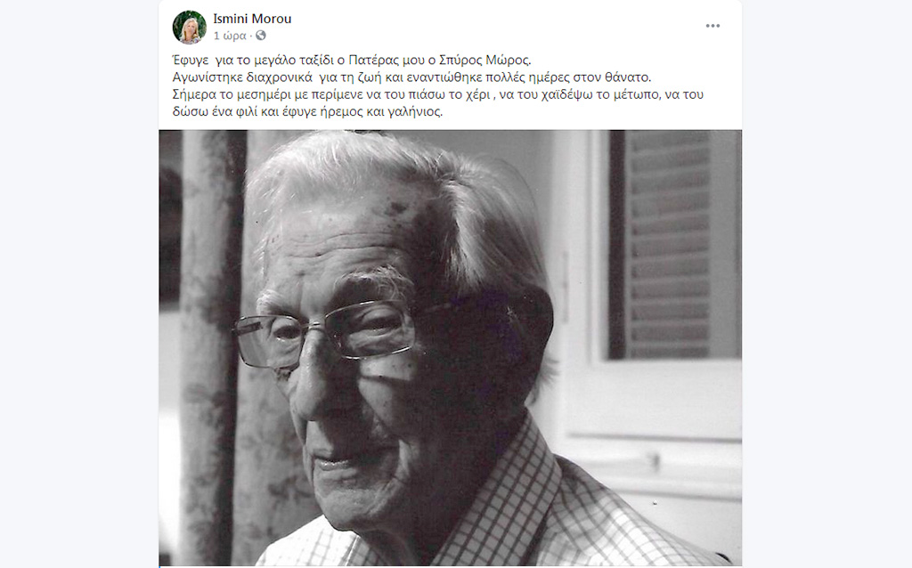 Για το Σπύρο Μώρο η ανάρτηση του γνωστού χορογράφου και σκηνοθέτη Πέτρου Γάλλια: “Σήμερα έφυγε πλήρης ημερών, βιωμάτων και αγάπης ένας υπέροχος άνθρωπος. Ένας άνθρωπος πρότυπο. Ένας άνθρωπος ευλογημένος. Έφυγε όπως θα ονειρευόταν ο κάθε ένας μας. Στα 104 με την σοφία και τα λογικά του και στην αγκαλιά της κόρης του που λάτρευε. Ισμήνη μου. Πλάσμα λατρεμένο. Ευλογήθηκες με τους γονείς σου. Ευλογημένοι και εμείς που χάρη σε σένα τους συναντήσαμε στη ζωή μας. Και τους αγαπήσαμε. Η ευχή του πατέρα σου θα σε προστατεύει πάντα. Και η μορφή του θα μας θυμίζει την ομορφιά που έχουν οι φωτισμένοι, οι ευγενικοί, οι καλοί άνθρωποι. Αγαπημένε μας, καλό σου ταξίδι στο Φως. Θα σε αγαπάμε πάντα.”.
