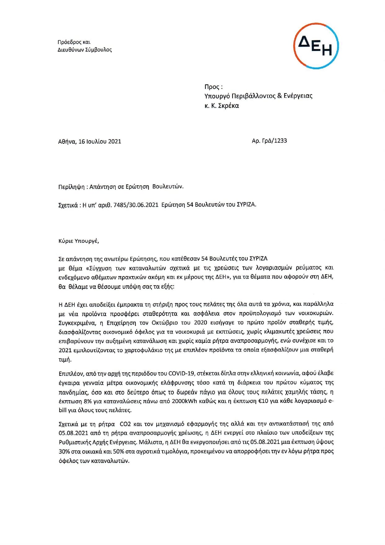 Στις 23 Ιουνίου 2021 πενήντα τέσσερις βουλευτές του ΣΥΡΙΖΑ-ΠΣ, με πρωτοβουλία του Τομεάρχη Περιβάλλοντος και Ενέργειας Σωκράτη Φάμελλου και συνυπογραφή του βουλευτή Κέρκυρας και Αναπληρωτή Τομεάρχη Τουρισμού ΚΟ ΣΥΡΙΖΑ-ΠΣ Αλέξανδρου Αυλωνίτη κατέθεσαν ερώτηση, αναδεικνύοντας τα προβλήματα που έχουν προκληθεί στους καταναλωτές από τον τρόπο χρεώσεων ηλεκτρικής ενέργειας και των αδικαιολόγητων επιβαρύνσεων στους λογαριασμούς τους.
