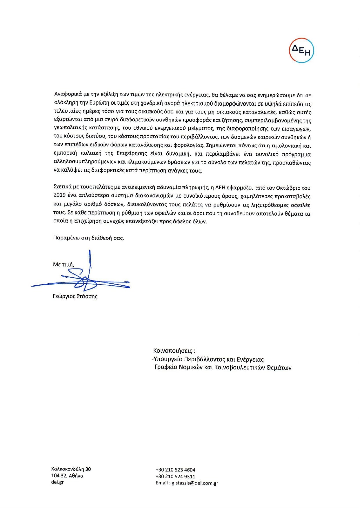 Ύστερα από την ερώτηση, μας απεστάλη η υπ’αριθμ. 61408/2567/2021 Απάντηση, την οποία υπογράφει ο Υπουργός Περιβάλλοντος και Ενέργειας. Η απάντηση ήταν γενικόλογη, ενώ φάνηκαν οι προθέσεις της κυβέρνησης να μετακυλήσει τις ευθύνες στους καταναλωτές, αναφέροντας χαρακτηριστικά πως «Τα τιμολόγια ηλεκτρικής ενέργειας ως προς το ανταγωνιστικό σκέλος, είναι απελευθερωμένα» και πως θα πρέπει να τηρούνται ορισμένες γενικές αρχές σχετικά με την τιμολόγηση. Μόνο η δήλωση προθέσεων του Υπουργείου και η αόριστη αναφορά σε «αρχές» δεν αρκούν αν δεν συνδυάζονται με οργανωμένη προσπάθεια για τη συγκράτηση των τιμών και την προστασία των καταναλωτών. Οι πολίτες έχουν μεγάλο πρόβλημα, καθώς πρακτικά δεν γνωρίζουν τι πληρώνουν και χρειάζονται συγκεκριμένες λύσεις.