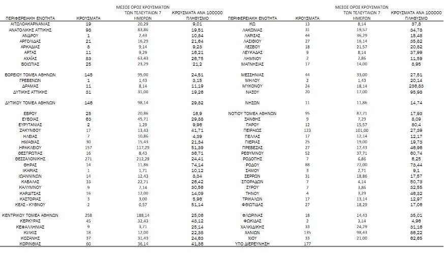 Αναλυτικά, η διασπορά των νέων κρουσμάτων ανά περιφερειακή ενότητα: