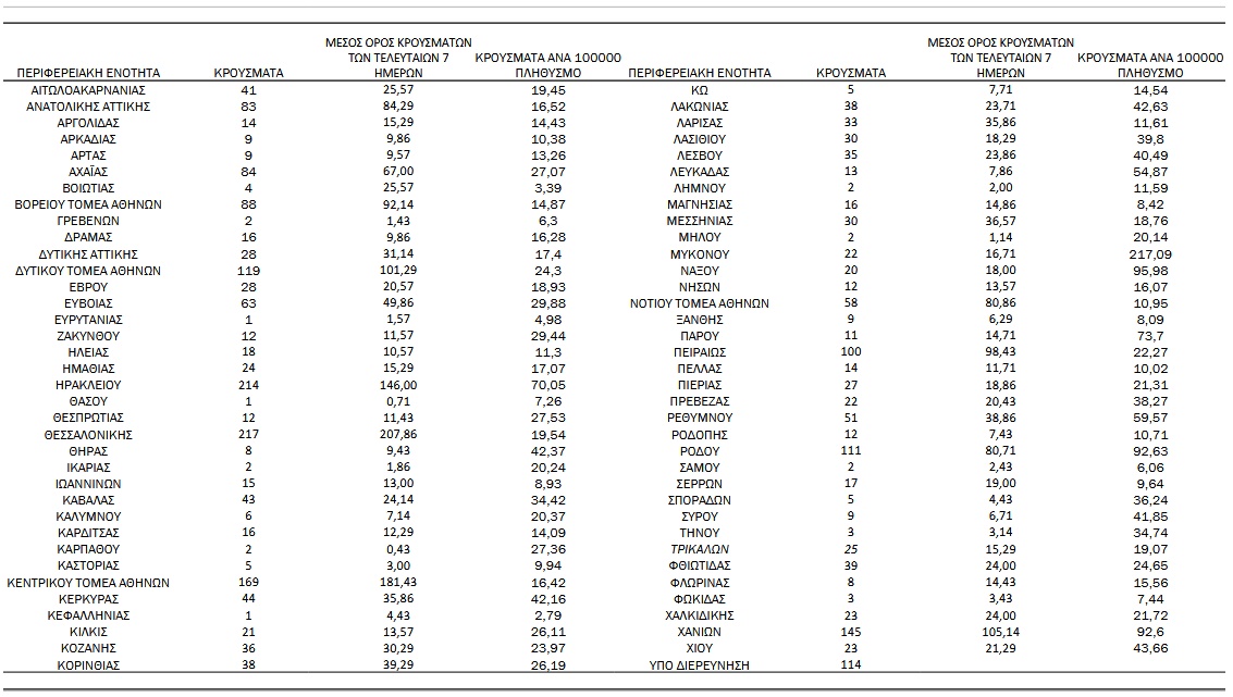 Αναλυτικά, η διασπορά των νέων κρουσμάτων ανά περιφερειακή ενότητα: