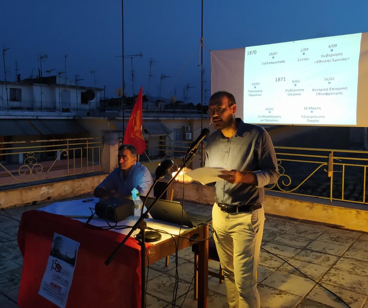 Στο κλείσιμο της εισήγησης ο ομιλητής επικεντρώθηκε στη δύναμη που πρέπει να αντλούμε από τέτοιες στιγμές της ιστορίας που πρέπει να μας εμπνέουν για το σήμερα και το αύριο, λέγοντας: “Η Κομμούνα ηττήθηκε. Αλλά άφησε έναν φάρο που γεμίζει τους εργάτες όλου του κόσμου με έμπνευση και με θαυμασμό, άνοιξε δρόμο για τη νικηφόρα σοσιαλιστική επανάσταση στη Ρωσία το 1917.