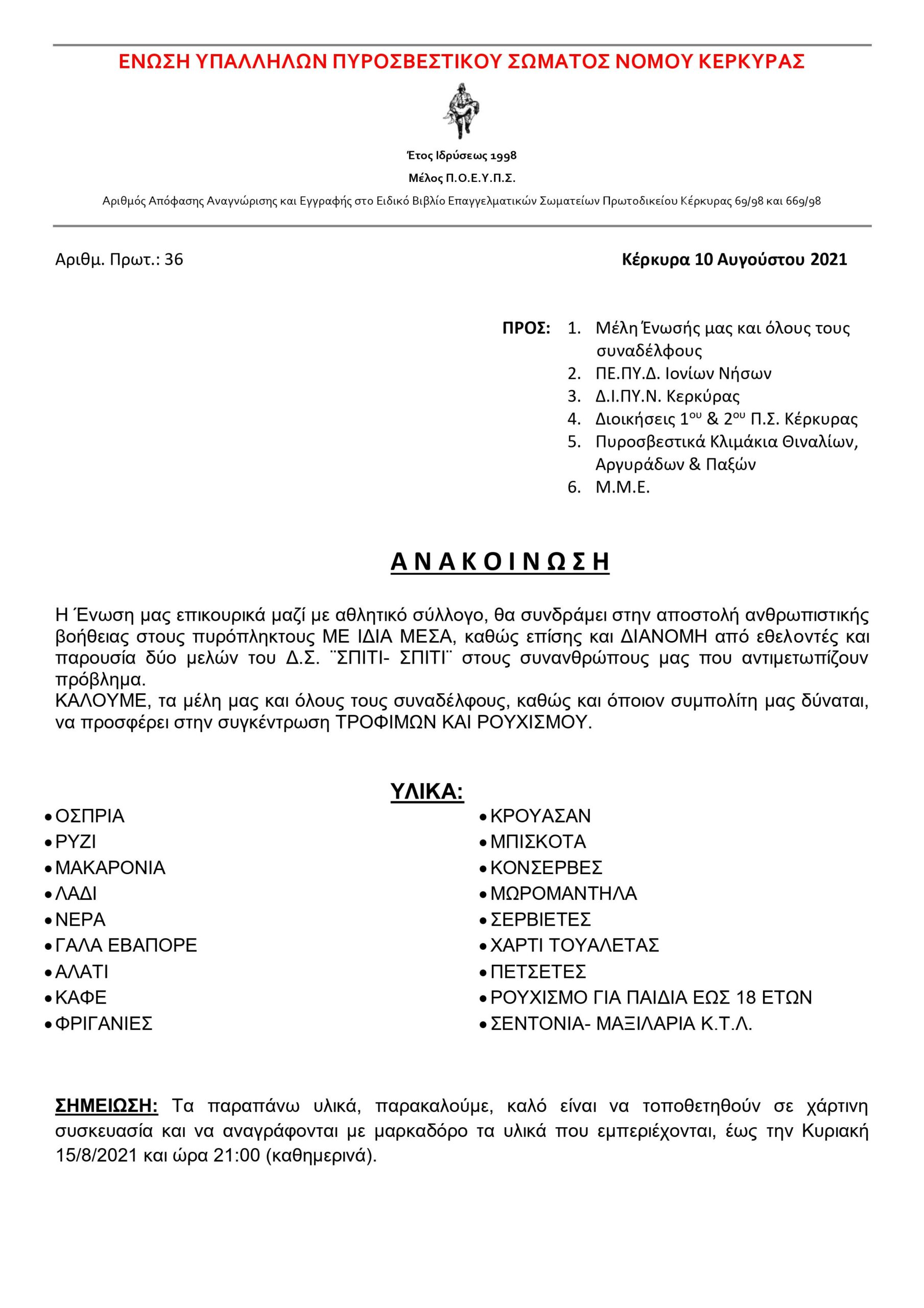 Η Ένωση Υπαλλήλων Πυροσβεστικού Σώματος Κέρκυρας θα συνδράμει στην αποστολή ανθρωπιστικής βοήθειας στους πυρόπληκτους.