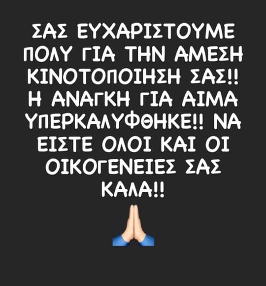 Μάλιστα, η ανταπόκριση του κόσμου ήταν τέτοια που το πρωί του Σαββάτου, η οικογένεια της 27χρονης με ανάρτησή της αφού ευχαρίστησε όλους για την κινητοποίηση γνωστοποίησε πως η ανάγκη για αίμα υπερκαλύφθηκε.