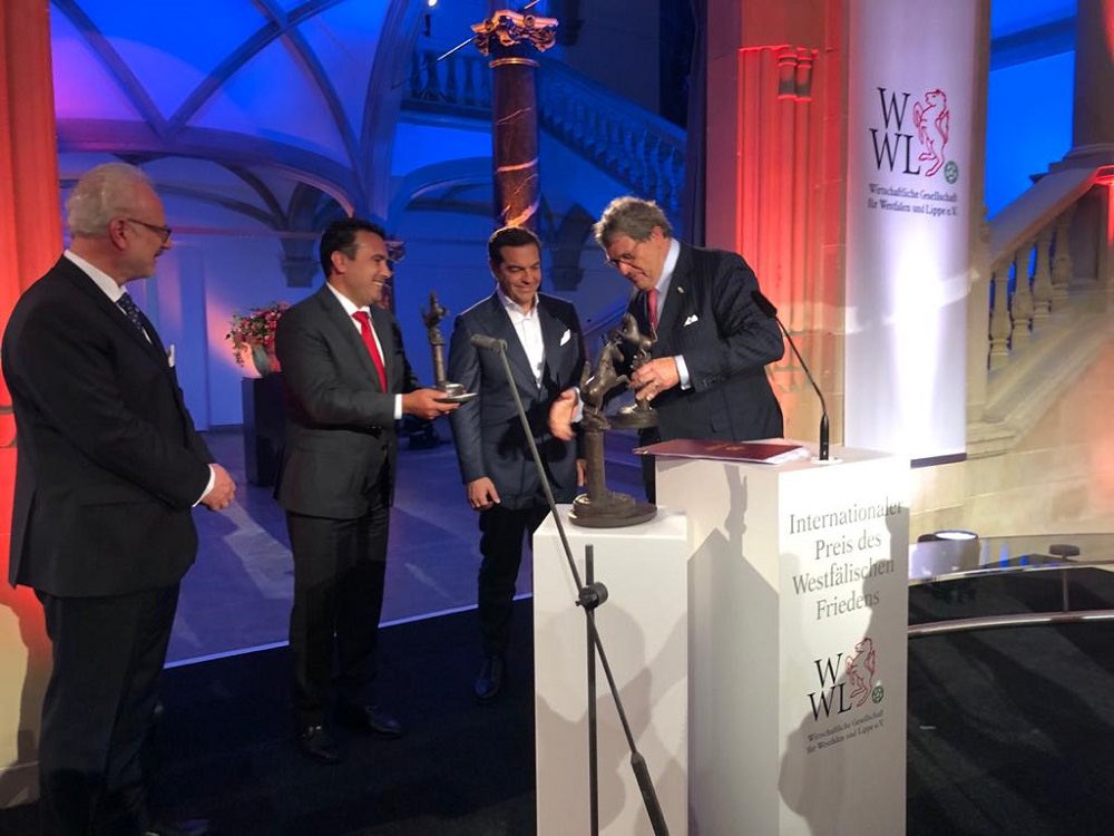Στη σημασία της «Συμφωνίας των Πρεσπών» αναφέρθηκε ο πρόεδρος του ΣΥΡΙΖΑ, Αλέξης Τσίπρας, κατά την τελετή ανάληψης του βραβείου Βεστφαλίας, από κοινού με τον πρωθυπουργό της Βόρειας Μακεδονίας, Ζόραν Ζάεφ.