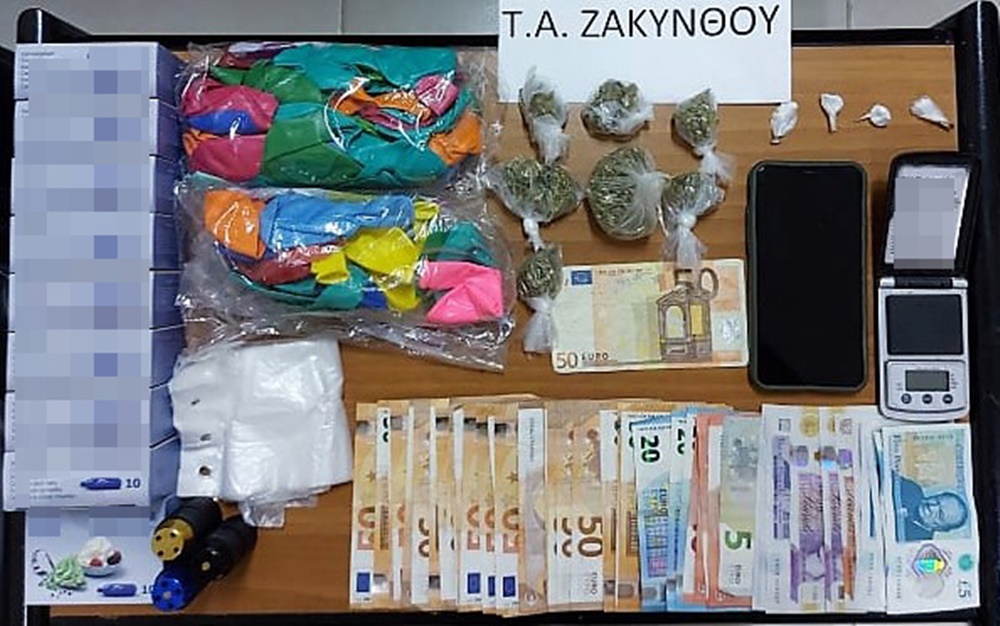 Στη συνέχεια, σε έρευνα που πραγματοποιήθηκε, από αστυνομικούς του Τμήματος Ασφάλειας Ζακύνθου, παρουσία δικαστικού λειτουργού, στην επιχείρηση και στην οικία του, βρέθηκαν επιμελώς κρυμμένες, σε διάφορους χώρους και κατασχέθηκαν, συσκευασίες με ακατέργαστη κάνναβη βάρους -16,2- γραμμαρίων, κοκαΐνη βάρους -1,8- γραμμαρίων, μια ζυγαριά ακριβείας, το χρηματικό ποσό των -1.655- ευρώ, ένα χαρτονόμισμα των -50- ευρώ αμφιβόλου γνησιότητας, -180- λίρες Αγγλίας, καθώς και -90- αμπούλες αερίου γέλιου (Laughing Gas) και τρείς (3) συσκευασίες εκτόνωσης αυτών.