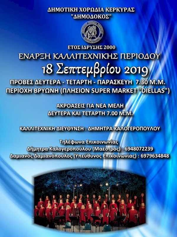 Η Δημοτική Χορωδία Κέρκυρας «ΔΗΜΟΔΟΚΟΣ» ανακοινώνει ότι από την Δευτέρα 6 Σεπτεμβρίου 2021 ξεκινά τις εγγραφές νέων μελών.