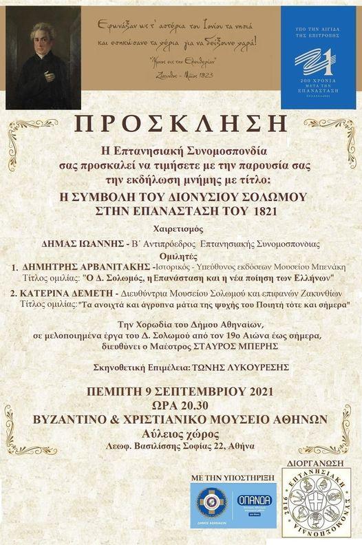 Eκδήλωση για την συμβολή του Δ. Σολωμού στην Επανάσταση του 1821, η οποία πραγματοποιείται υπό την Αιγίδα της Επιτροπής “ΕΛΛΑΔΑ 2021” και την υποστήριξη ΟΠΑΝΔΑ.