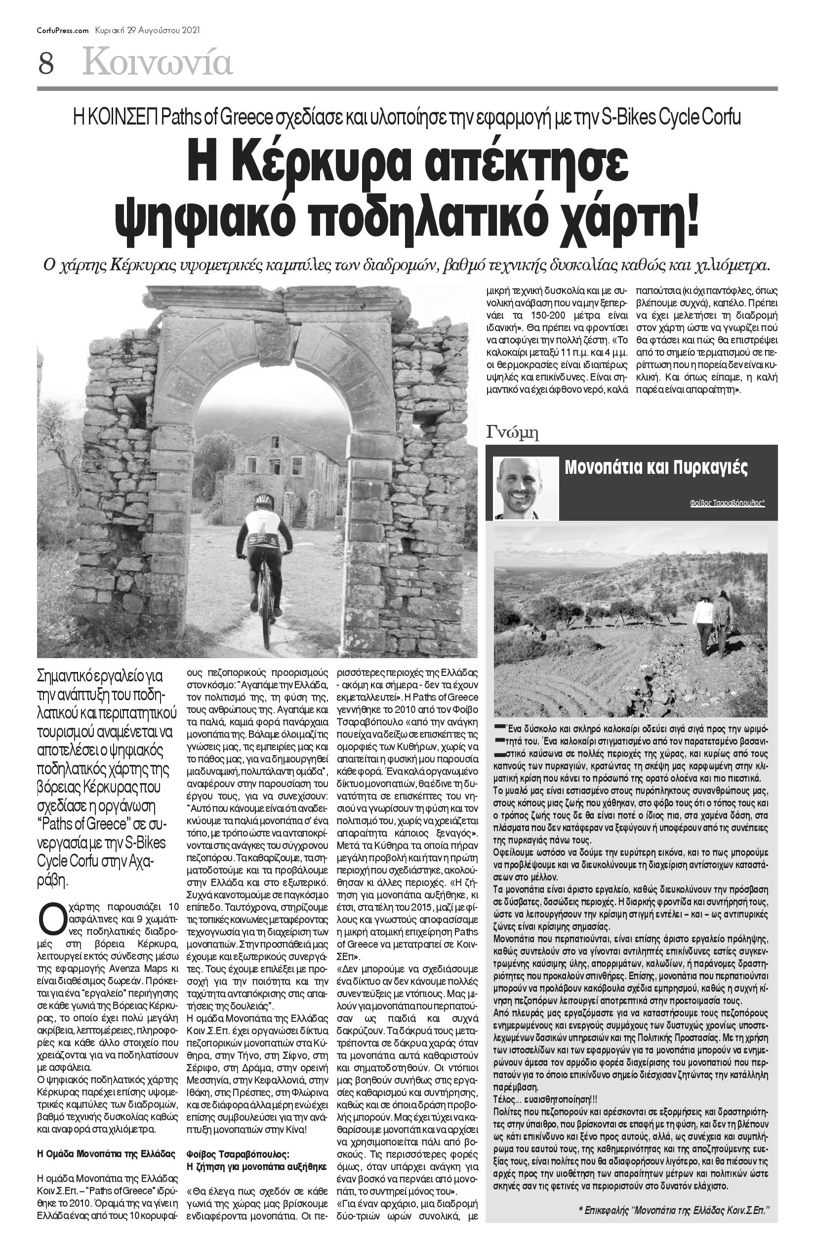Σημαντικό εργαλείο για την ανάπτυξη του ποδηλατικού και περιπατητικού τουρισμού αναμένεται να αποτελέσει ο ψηφιακός ποδηλατικός χάρτης της βόρειας Κέρκυρας που σχεδίασε η οργάνωση“Paths of Greece” σε συνεργασία με την S-Bikes Cycle Corfu στην Αχαράβη.