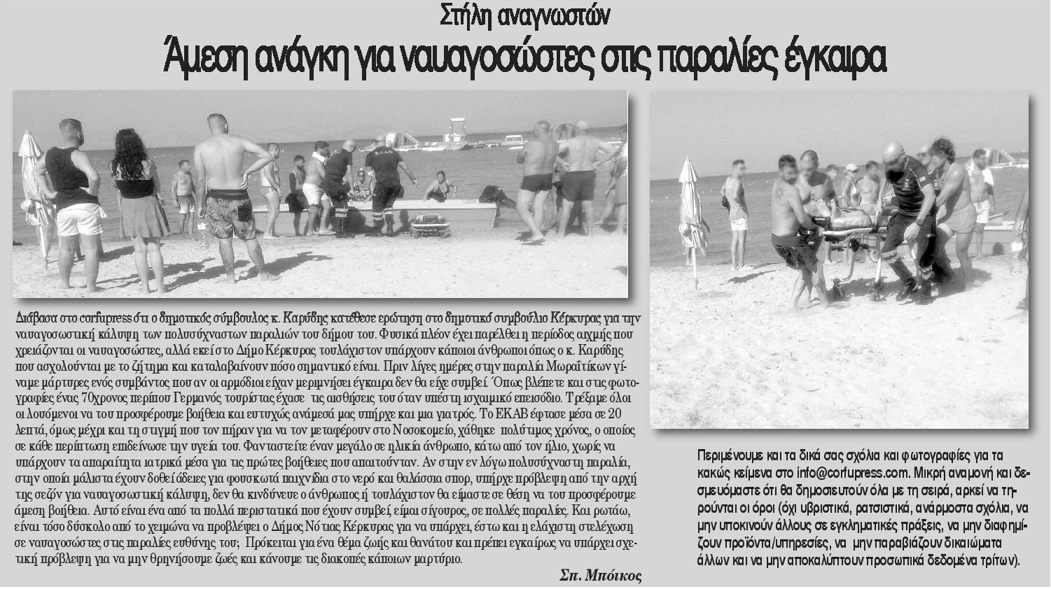 Διάβασα στο corfupress ότι ο δημοτικός σύμβουλος κ.Καρύδης κατέθεσε ερώτηση στο δημοτικό συμβούλιο Κέρκυρας για την ναυαγοσωστική κάλυψη των πολυσύχναστων παραλιών του δήμου του.