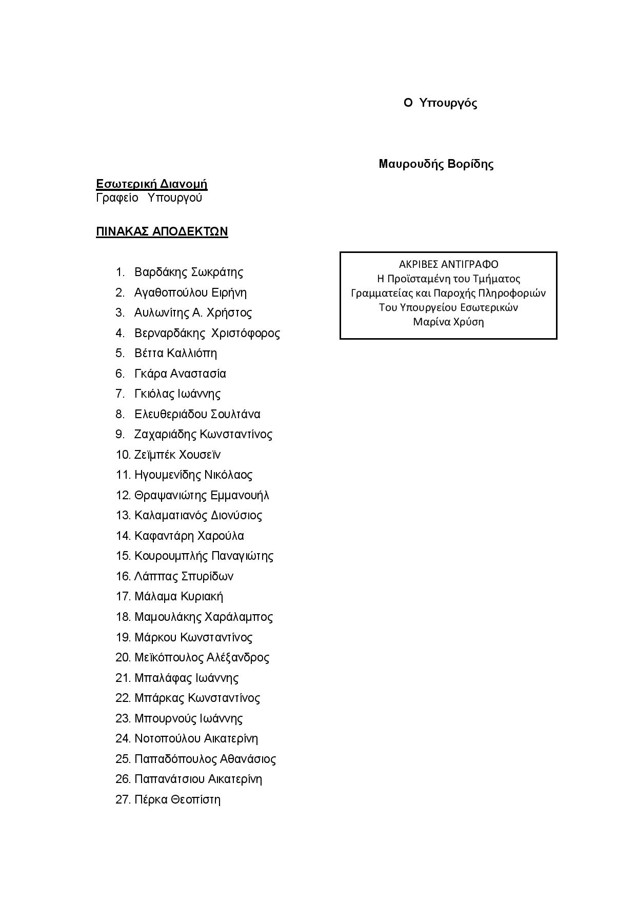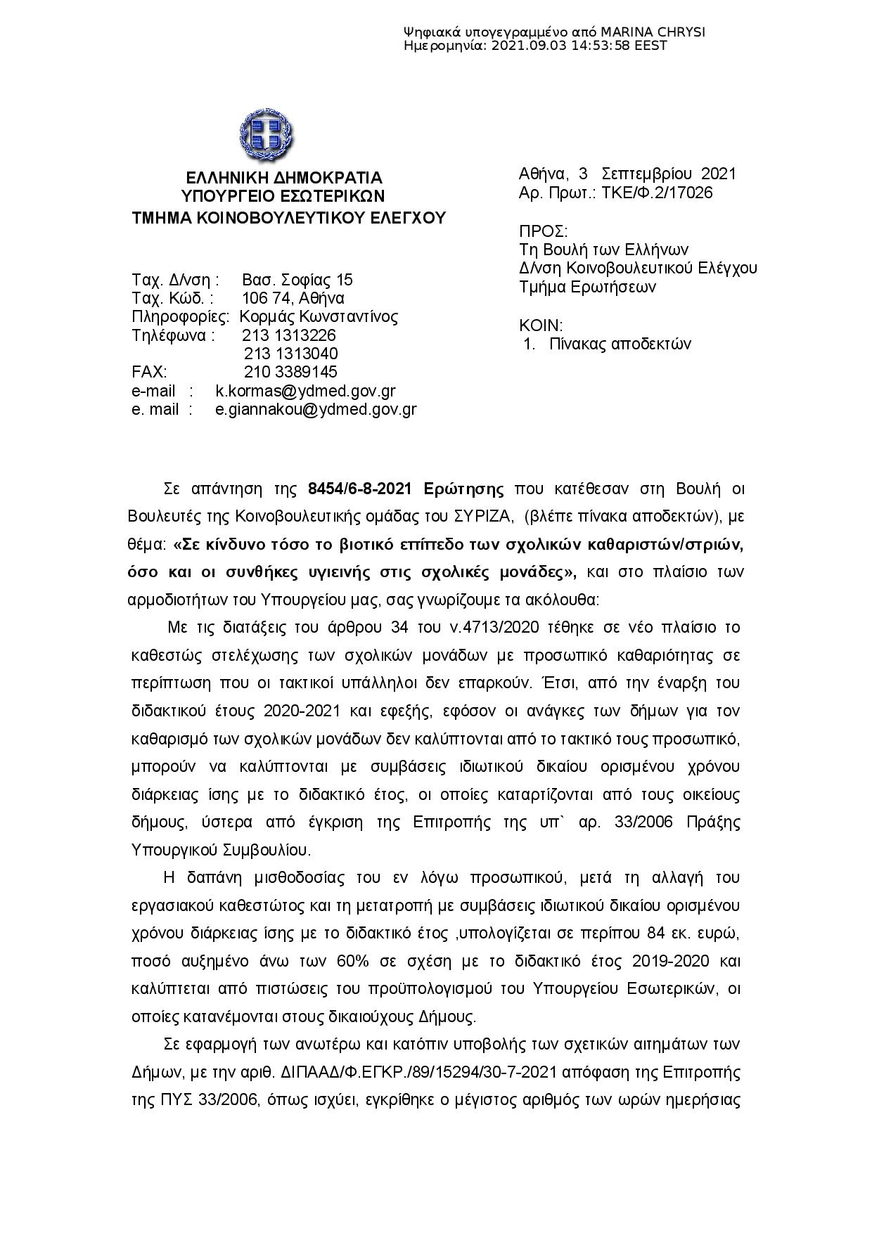 Στις 7 Αυγούστου 2021, σαράντα έξη βουλευτές του ΣΥΡΙΖΑ-Προοδευτική Συμμαχία, με πρωτοβουλία του βουλευτή Ηρακλείου ΣΥΡΙΖΑ-ΠΣ, Βαρδάκη Σωκράτη και συνυπογραφή του βουλευτή Κέρκυρας και Αν.Τομεάρχη Τουρισμού ΚΟ ΣΥΡΙΖΑ-ΠΣ Αλέξανδρου Αυλωνίτη, κατέθεσαν ερώτηση προς τον Υπουργό Εσωτερικών σχετικά με τις συνθήκες υγιεινής στις σχολικές μονάδες και την προστασία του βιοτικού επιπέδου των σχολικών καθαριστών/στριων.