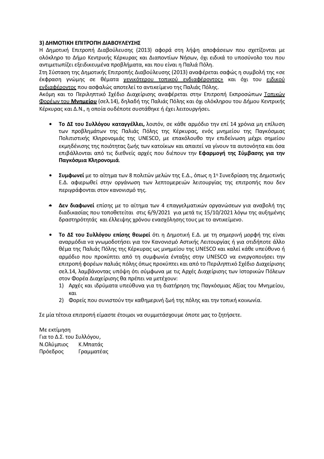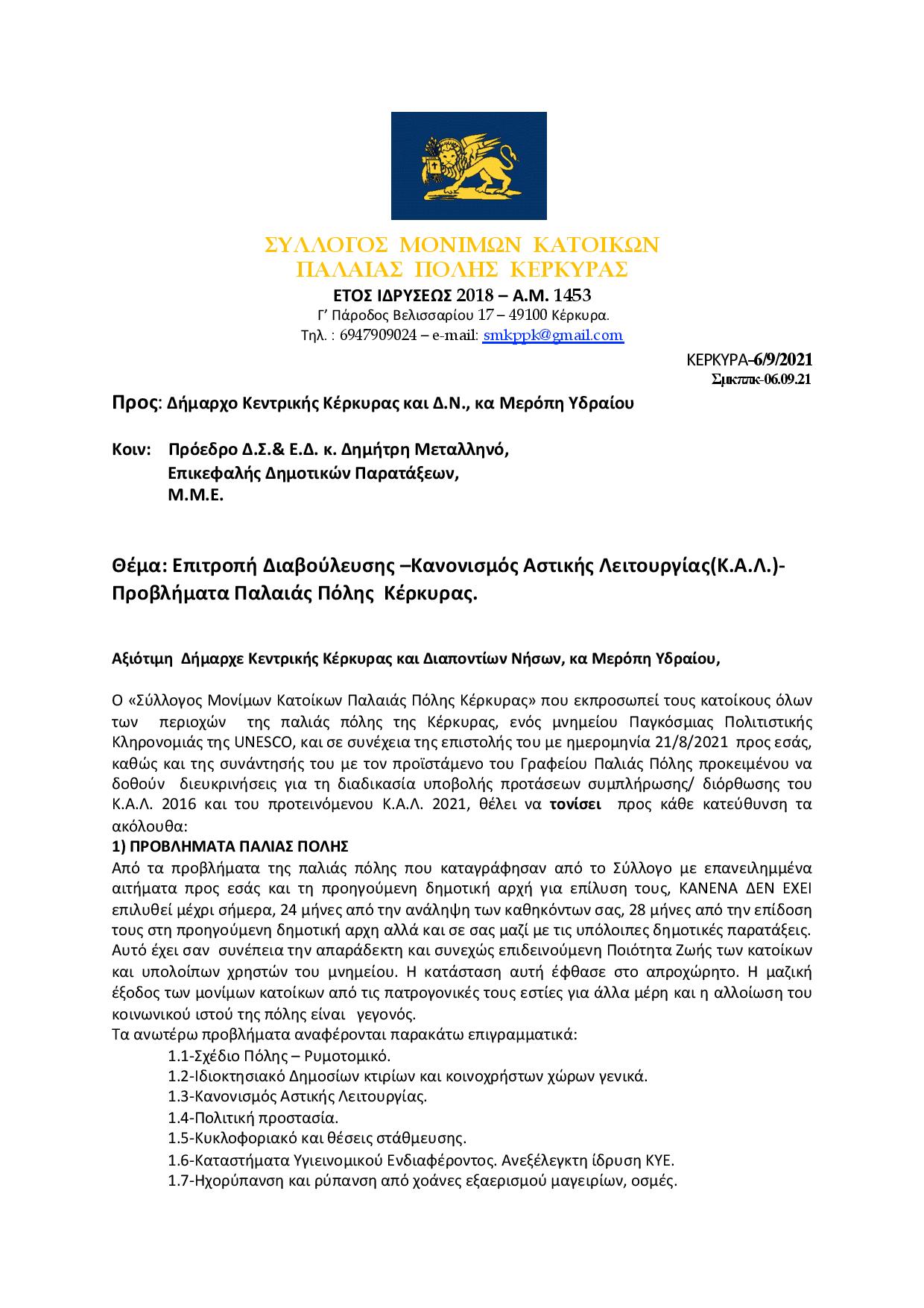 Επιστολή προς τη Μερόπη Υδραίου απέστειλε ο Σύλλογος Μονίμων Κατοίκων Παλαιάς Πόλης της Κέρκυρας για την επιτροπή διαβούλευσης, τον κανονισμό αστικής λειτουργίας και τα προβλήματα που υπάρχουν.