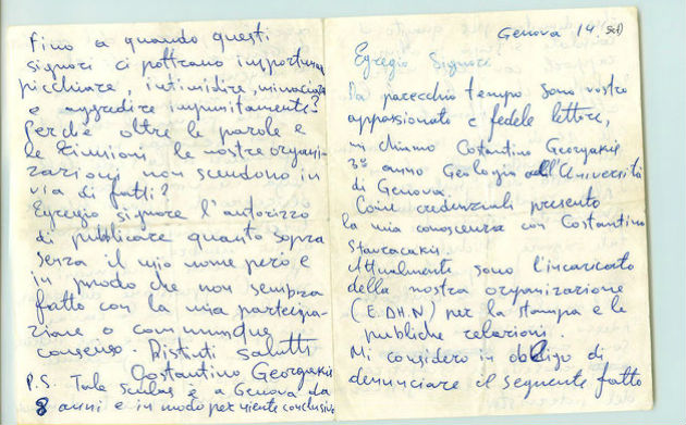 «Προς, αξιότιμο κύριο Σάντρο Σαμπατίνι, Ρώμη, Οδός Ντελ Κόρσο . Τον καιρό αυτό είμαι ο αρμόδιος της οργανώσεώς μας (ΕΔΗΝ) για τον Τύπο και τις δημόσιες σχέσεις. …Παραχώρησα συνέντευξη… σε σχετική ερώτηση του δημοσιογράφου απάντησα ότι κάποιος κύριος (με αρχικά) Σ.Μ. ήταν μέλος της “οργανώσεως ελέγχου” του ελληνικού προξενείου Γένοβας. Για λόγους που δεν κατάφερα ακόμη να ανακαλύψω, η μαγνητοταινία της συνεντεύξεώς μου βρέθηκε στην κατοχή του προξενείου της Γένοβας, το οποίο κάλεσε κατεπειγόντως τον εν λόγω “κύριο” και σε μια σύσκεψη, η οποία διεξήχθη αρχικά στο προξενείο και στη συνέχεια –σύμφωνα με τους πληροφοριοδότες μου– στην έδρα της “Λέγκα” στην οδό Καϊρόλι αποφασίστηκε “να μου σιάξουν τη γραβάτα”… χρησιμοποιώντας επακριβώς την έκφραση ενός μέλους… και πράγματι, την επομένη δέχτηκα την επίθεση του “κυρίου” Σ. Από την οποία γλίτωσα χάρη στην επέμβαση ενός φίλου… … και τώρα σας θέτω το εύλογο ερώτημα. Ώς πότε αυτοί οι “κύριοι” θα μπορούν ατιμώρητα να μας ταλαιπωρούν, να μας δέρνουν, να μας εκφοβίζουν, να μας απειλούν και να μας επιτίθενται; Γιατί, εκτός από λόγια και συνελεύσεις, οι οργανώσεις μας δεν περνάνε σε πράξεις…
