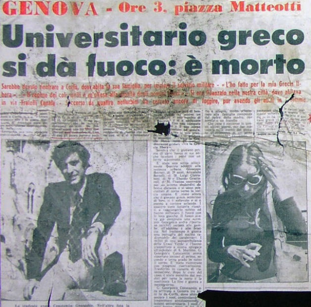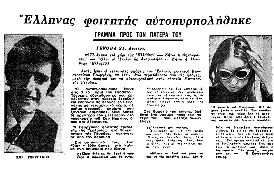 Το αφιέρωμα του συγγραφέα και ερευνητή Κωνσταντίνου Παπούτση για την υπέρτατη θυσία του Κώστα Γεωργάκη, πρωτοδημοσιεύτηκε στην Εφημερίδα των Συντακτών και το ένθετο “Νησίδες” στις 17 Σεπτεμβρίου του 2016. Βασίζεται στην έρευνα και τα ιστορικά ντοκουμέντα που επί δεκαετίες συνέλλεξε και ανέδειξε ο συγγραφέας για την ηρωική πράξη του Κερκυραίου φοιτητή που αυτοπυρπολήθηκε στις 19 Σεπτεμβρίου του 1970 στην Πλατεία Ματτεότι της Γένοβας ως ένδειξη διαμαρτυρίας για την Χούντα των Συνταγματαρχών. Στο αφιέρωμα, ο Κ. Παπούτσης περιγράφει το χρονικό των γεγονότων που προηγήθηκαν αλλά και ακολούθησαν αλλά και το αγωνιστικό παρελθόν του νεαρού φοιτητή.