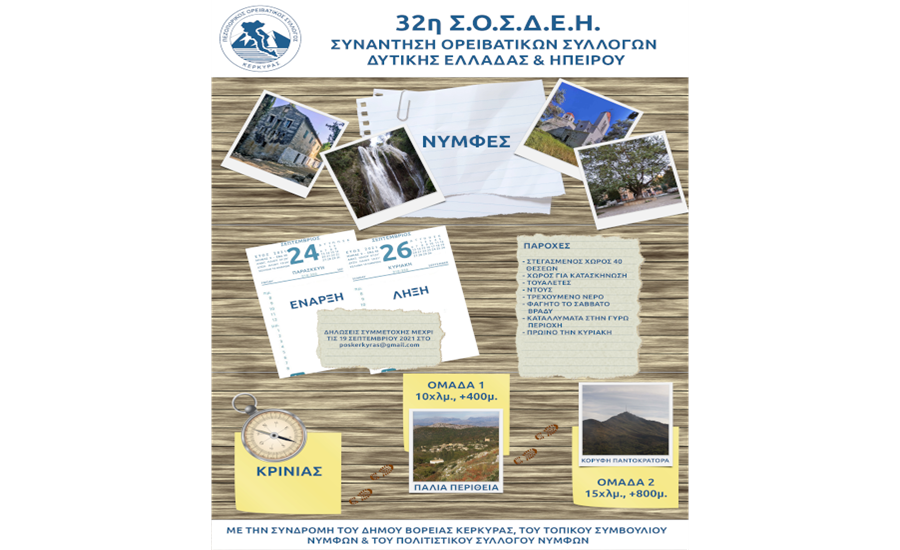 Για πρώτη φορά η ετήσια Συνάντηση Ορειβατικών Συλλόγων Δυτικής Ελλάδας και Ηπείρου (ΣΟΣΔΕΗ) θα γίνει στην Κέρκυρα.