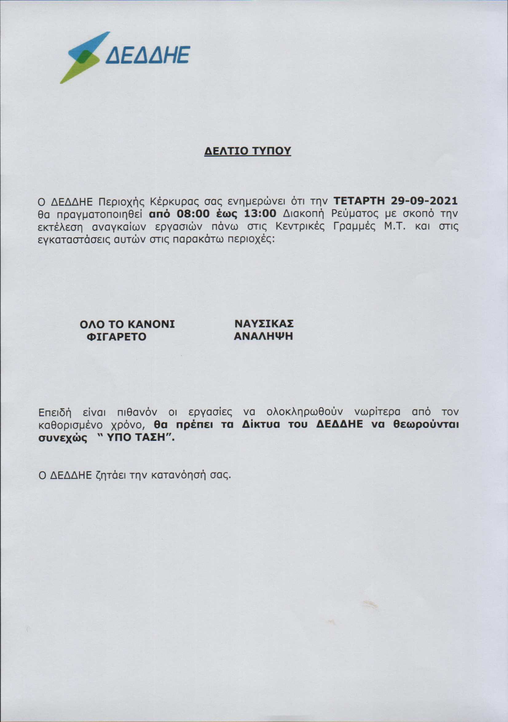 Οι διακοπές ρεύματος θα πραγματοποιηθούν την Τετάρτη το πρωί λόγω εργασιών του ΔΕΔΔΗΕ στις Κεντρικές Γραμμές Μεσαίας Τάσης.
