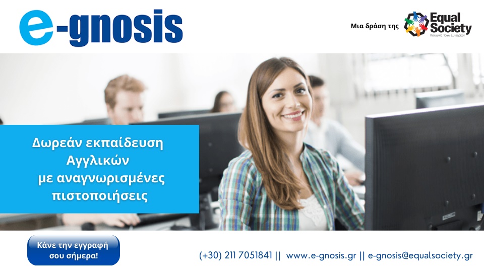 Η Equal Society πάντα πιστή στο όραμά της για ίση εκπαίδευση για όλους ανοίγει και φέτος το νέο κύκλο δωρεάν μαθημάτων Αγγλικών της πρωτοβουλίας E–gnosis προσφέροντας άμεσα, αναγνωρισμένη πιστοποίηση για τις προκηρύξεις ΑΣΕΠ και τον ιδιωτικό τομέα.