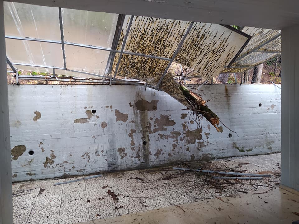 Το δέντρο κατά την πτώση του προκάλεσε ζημιές στα στέγαστρο του προαυλίου, το οποίο κατέρρευσε.