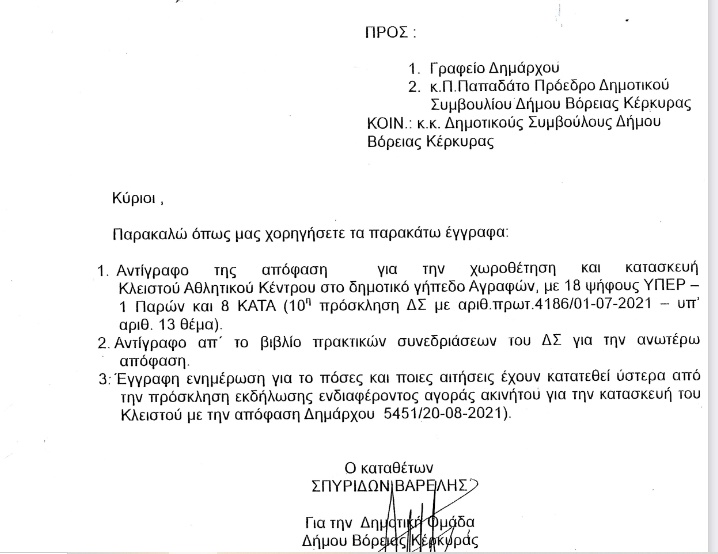 Νέο αίτημα της παράταξης του Σπύρου Βάρελη προς το δήμαρχο και τον πρόεδρο του δημοτικού συμβουλίου με το οποίο ζητά έγγραφα για το κλειστό αθλητικό κέντρο.