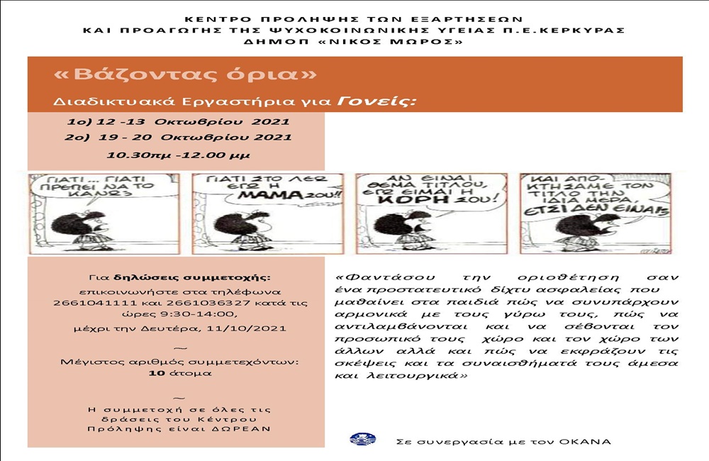 Αν είστε γονείς μικρών παιδιών αλλά και εφήβων σας προσκαλούμε να λάβετε μέρος στα διαδικτυακά εργαστήρια με τίτλο «Βάζοντας όρια» που διοργανώνει το Κέντρο Πρόληψης των Εξαρτήσεων και Προαγωγής της Ψυχοκοινωνικής Υγείας Π.Ε. Κέρκυρας, ΔΗ.ΜΟ.Π. «Ν. Μώρος»