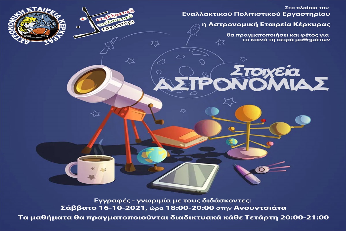 Η Αστρονομική Εταιρεία Κέρκυρας ενημερώνει τα μέλη και τους φίλους της ότι στο πλαίσιο της λειτουργίας του Εναλλακτικού Πολιτιστικού Εργαστηρίου θα πραγματοποιήσει και για τη φετινή χρονιά σειρά μαθημάτων Αστρονομίας.