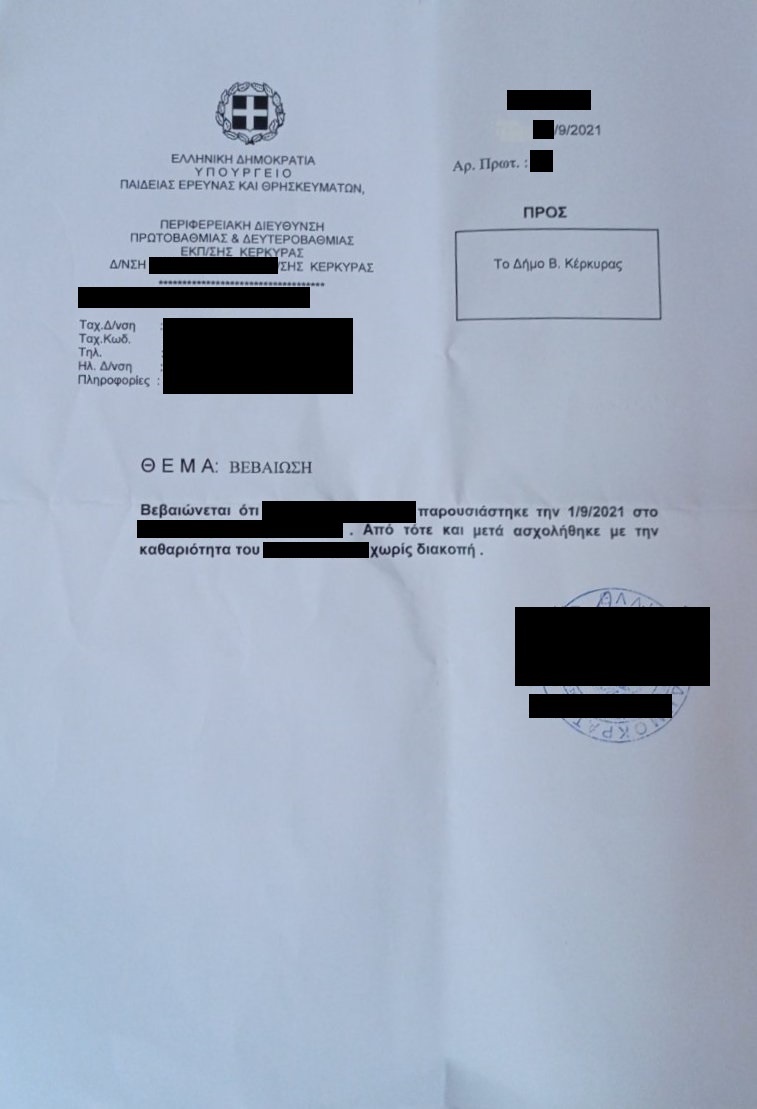 Τις τελευταίες ημέρες καταφτάνουν στον Κερκυραϊκό Σύνδεσμο Ιδιωτικών Υπαλλήλων αποδεικτικά στοιχεία από συμβασιούχους εργαζόμενους στην καθαριότητα των σχολείων του Δήμου της Βόρειας Κέρκυρας, τα οποία τεκμηριώνουν ότι ο Δήμος είχε τους συναδέλφους να δουλεύουν “μαύρα”! Πρόκειται για βεβαιώσεις των υπευθύνων των σχολικών μονάδων που εργάζεται ο κάθε συνάδελφος, από τις οποίες προκύπτει ότι ασκούσε τα καθήκοντά του χωρίς διακοπή στην καθαριότητα της σχολικής μονάδας πολλές ημέρες πριν την υπογραφή της σύμβασης!