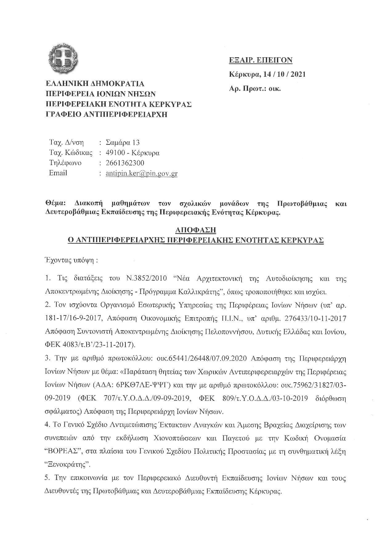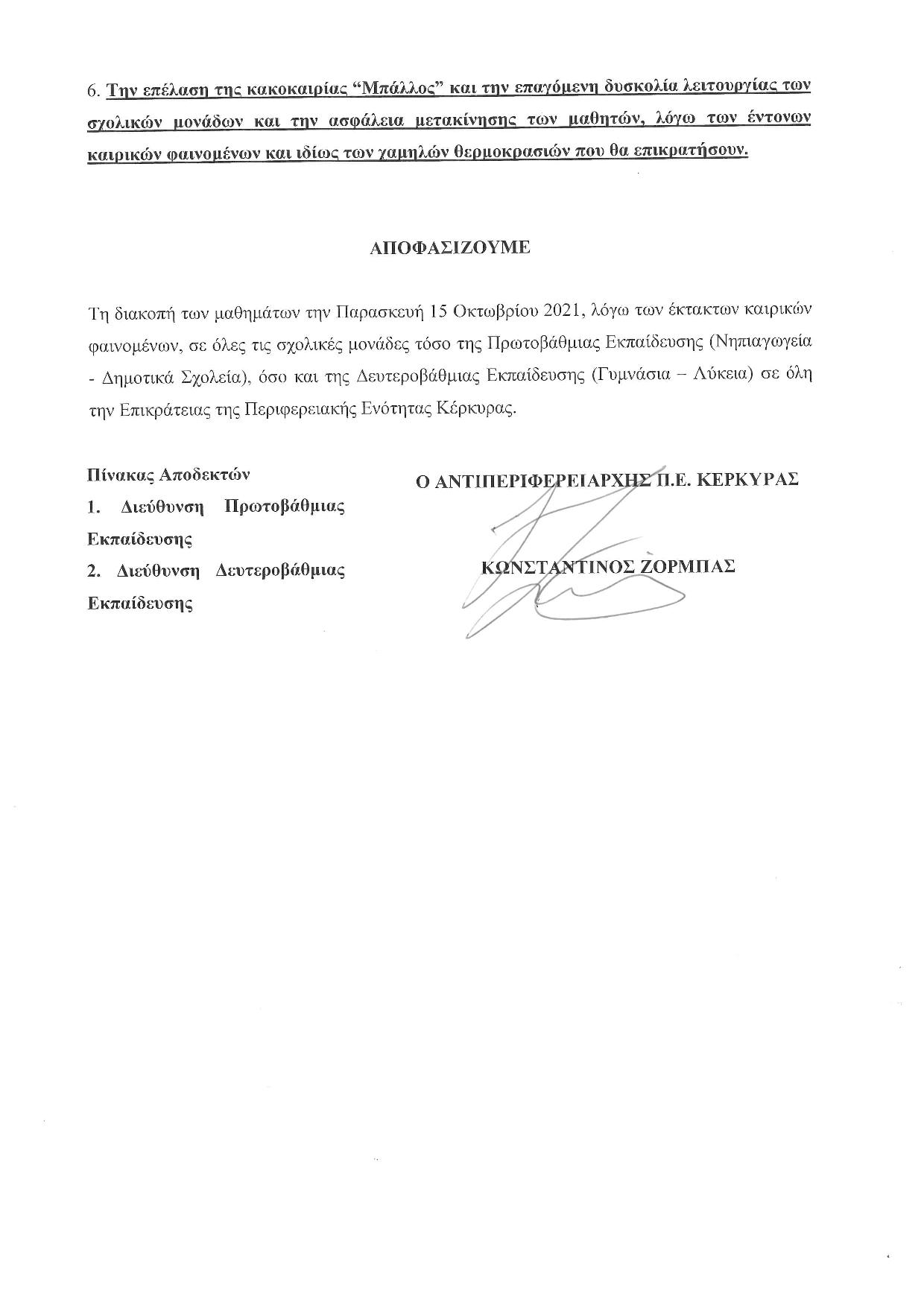 Ο Αντιπεριφερειάρχης Κέρκυρας Κώστας Ζορμπάς αποφάσισε, λόγω της κακοκαιρίας, τη διακοπή των μαθημάτων την Παρασκευή σε όλα τα σχολεία της περιφερειακής ενότητας.