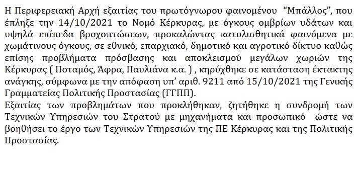 Με επιστολή του ο Αντιπεριφερειάρχης Κέρκυρας, μετά την κήρυξη του νησιού σε κατάσταση έκτακτης ανάγκης, ζήτησε τη συνδρομή των τεχνικών υπηρεσιών του στρατού με μηχανήματα και προσωπικό.