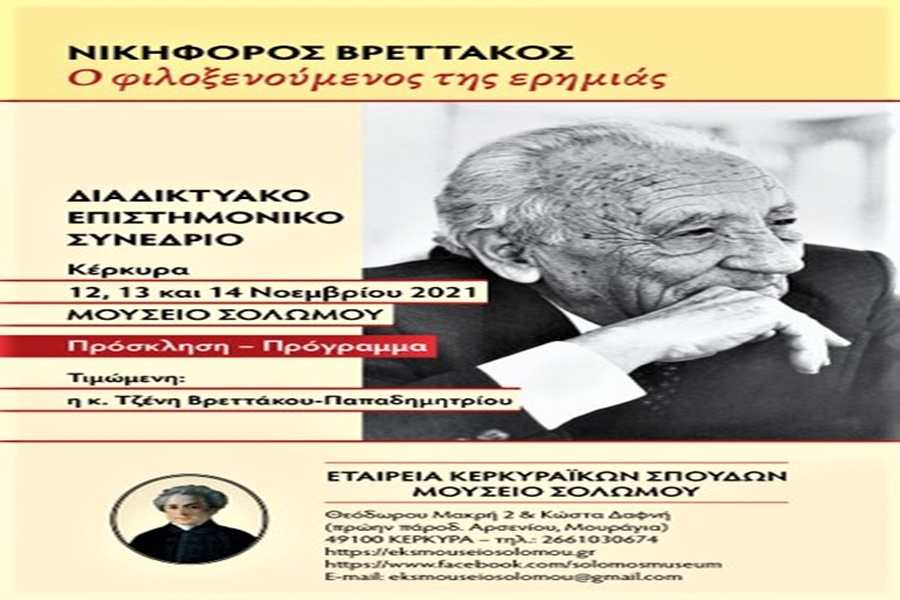Το Επιστημονικό συνέδριο της Εταιρείας Κερκυραϊκών Σπουδών με θέμα: «Νικηφόρος Βρεττάκος, ο φιλοξενούμενος της ερημιάς», που δεν είχε πραγματοποιηθεί τον περσινό Νοέμβριο (2020) λόγω των υγειονομικών περιορισμών, θα πραγματοποιηθεί φέτος (12, 13 και 14 Νοεμβρίου 2021) διαδικτυακά, λαμβανομένων υπόψη των ειδικών υγειονομικών συνθηκών.