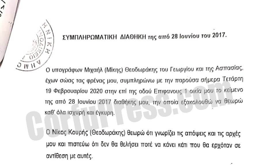 Παράλληλα, στο πρωτοκολλημένο και σφραγισμένο κείμενο της τελικής διαθήκης με ημερομηνία19/2/2020, υπογραμμίζει ότι το κείμενο συμπληρωματικής διαθήκης της 28/6/2017 είναι καθ΄ όλα ισχυρό και έγκυρο, στο οποίο τον αναφέρει ως «Νίκο Κουρή (Θεοδωράκη)» γράφοντας επακριβώς: