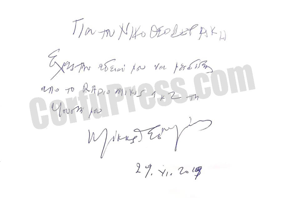 Φωτογραφίες από την πρωτότυπη διαθήκη έδωσε σήμερα το βράδυ στη δημοσιότητα ο ίδιος ο Νίκος, όπου φαίνεται χειρόγραφο σημείωμα του Μίκη που αναφέρει τα εξής:
