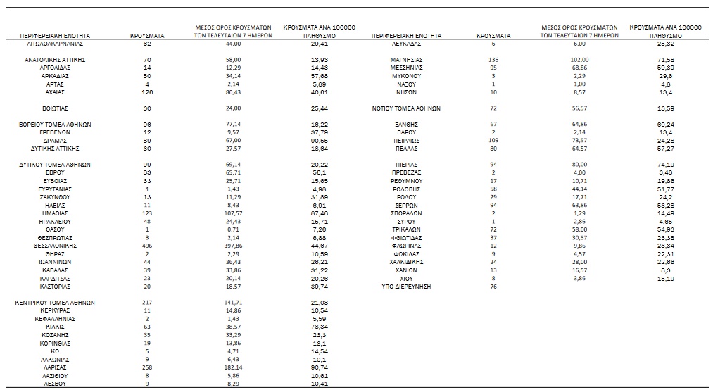 Αναλυτικά, η διασπορά των νέων κρουσμάτων ανά περιφερειακή ενότητα: