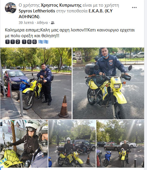 Ο πρόεδρος των εργαζομένων στο Εθνικό Κέντρο Άμεσης Βοήθειας Χρήστος Κυπριώτης, ανάρτησε φωτογραφίες από την Αθήνα όπου βρίσκεται στις οποίες απεικονίζεται μαζί με άλλους διασώστες στο Κ.Υ. Αθηνών του ΕΚΑΒ, μπροστά στις μοτοσικλέτες που διαθέτει η υπηρεσία.